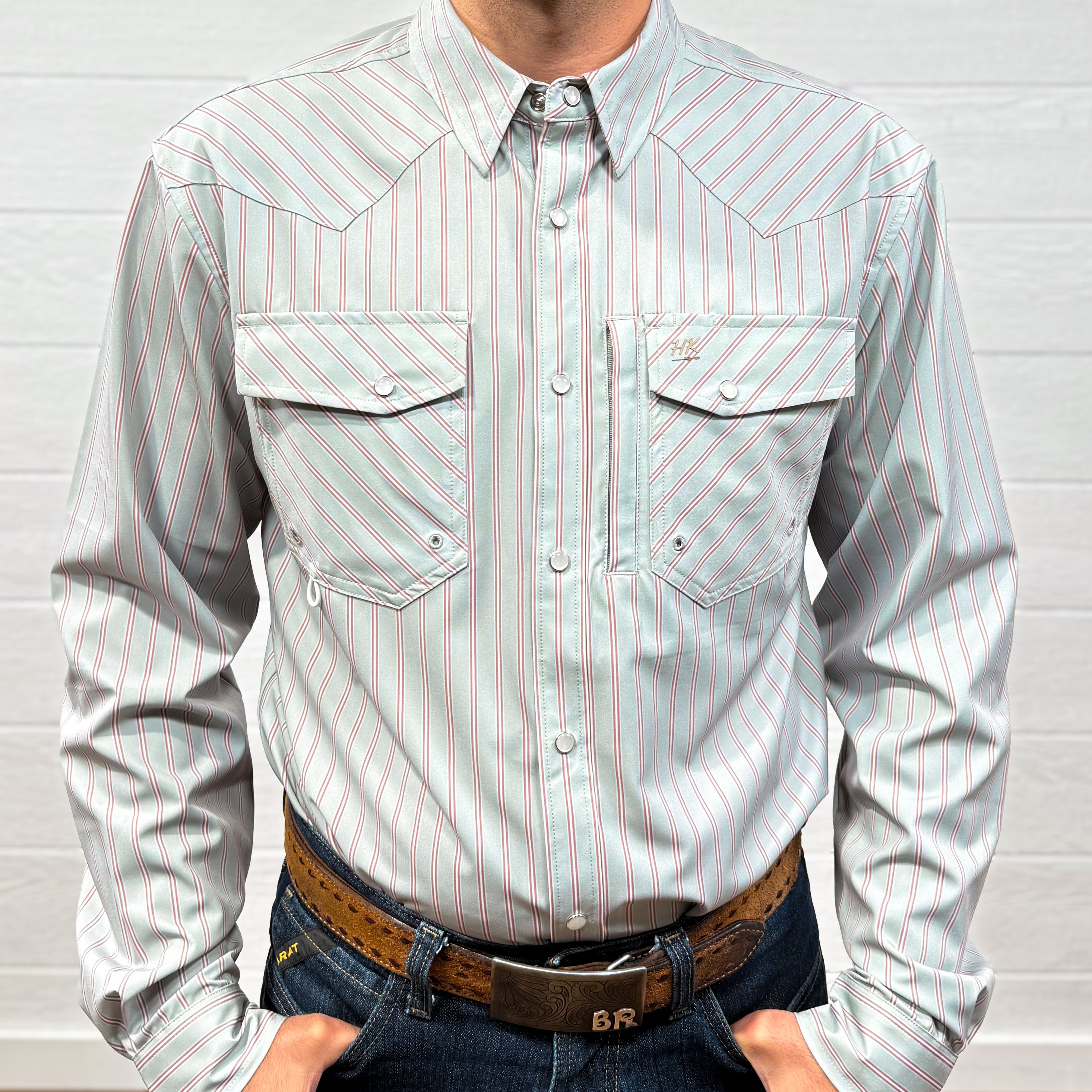 Man wearing a striped shirt and jeans with a belt buckle against a white background. Front Facing