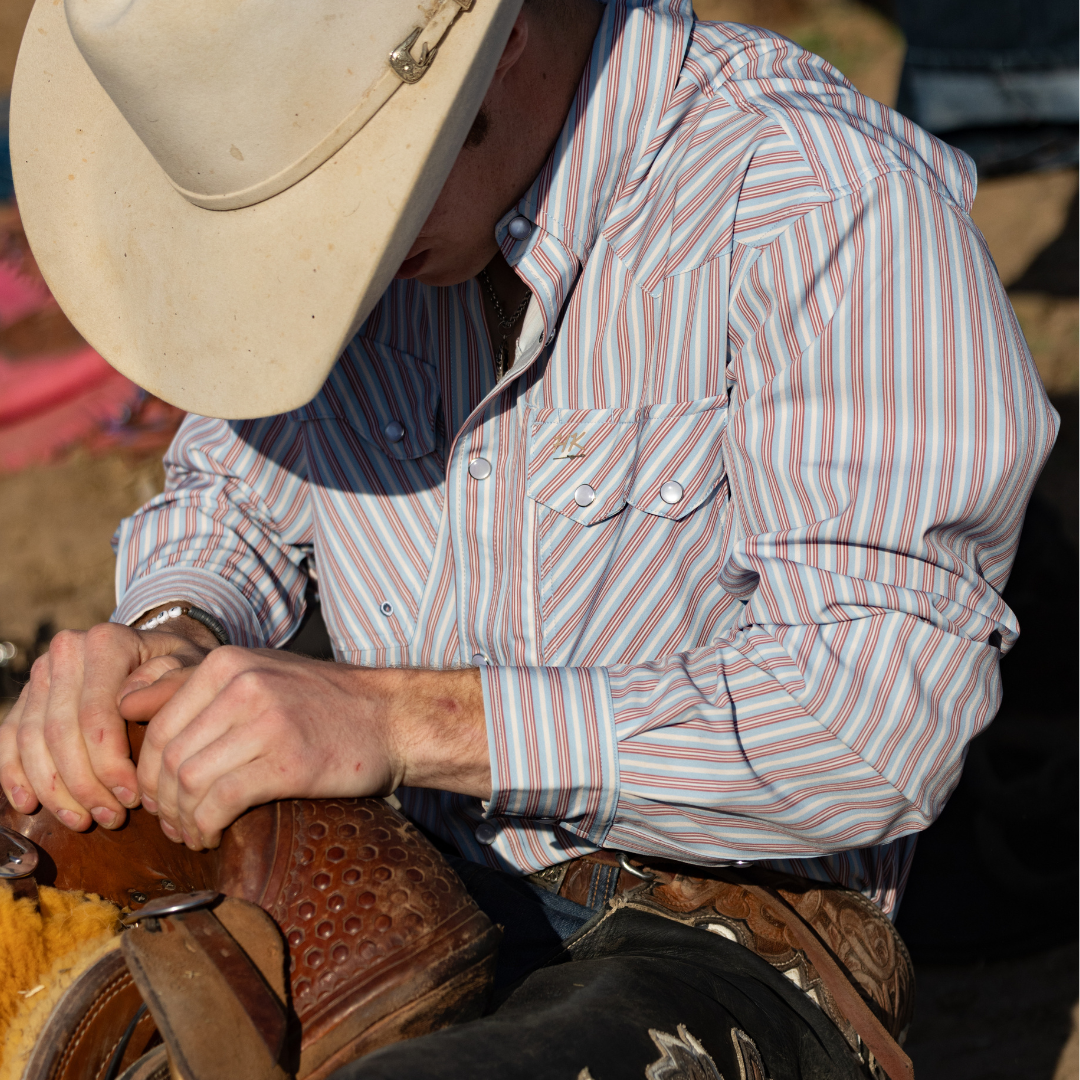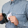 This shirt combines classic western style with modern functionality, making it perfect for both work and everyday wear. Designed with our Cowboy Fit, it offers a slimmer, tailored silhouette while still allowing freedom of movement thanks to the built-in stretch. The fabric is soft, lightweight, and breathable, ensuring all-day comfort in any condition. Thoughtful features include our patent pending Always within Reach lens cloth pocket for cleaning glasses or lenses, a pen holder, and a chest pocket for added convenience. We even took the design a step further and extending the tail & sleeve length for ultimate mobility when working, riding or roping. At the wrist you will find two pearl snaps for the ability to adjust sleeve size. Traditional pearl snaps and a western vented yoke complete the look, blending timeless design with practical details for the modern cowboy.